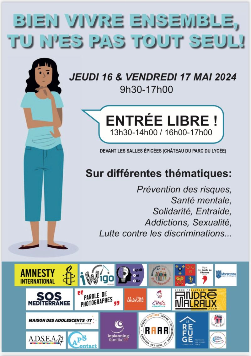 De loin en Loing a participé à la seconde édition du forum « bien vivre ensemble, tu n’es pas tout seul ! » des 16 et 17 mai 2024 organisé au lycée André Malraux à Montereau-Fault-Yonne. Le forum a eu lieu dans le parc des communs du château, lieu idéal au cœur des 17 hectares du lycée.